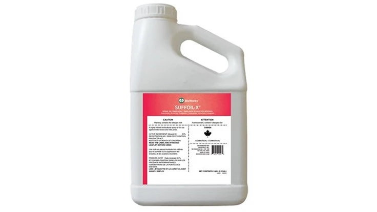 SuffOil-X is compatible with pesticides labeled for use with oil and is exempt from residue tolerance. BioWorks offers SuffOil-X in 9.46, 113.56 and 945.35 liter sizes.