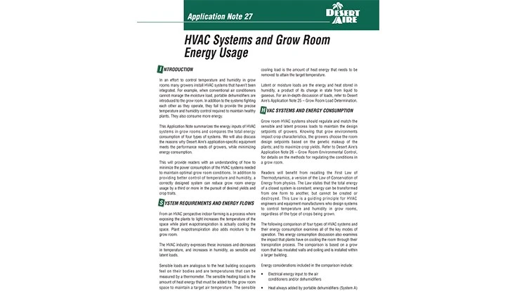 The publication “Application Note 27 – Grow Room Environmental Control” is available for download as a PDF document at desert-aire.com. To receive a printed copy of the publication, email sales@desert-aire.com.