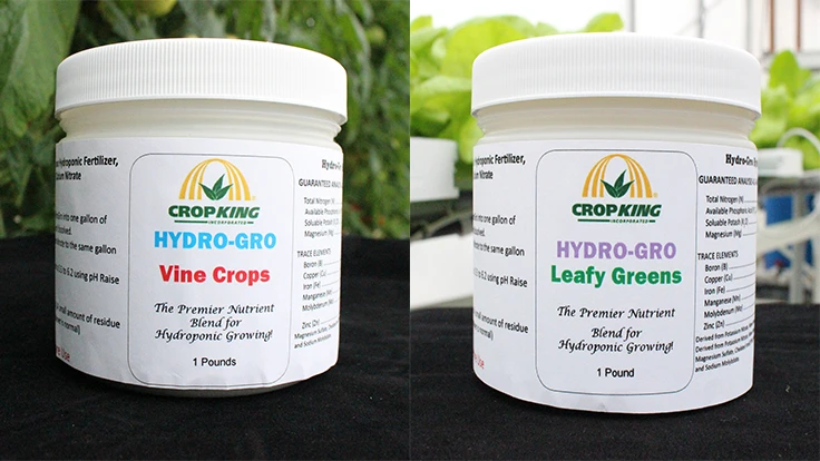 Hydro-Gro Leafy Greens and Hydro-Gro Vine Crops are the premier fertilizers for these crops. Comprised of greenhouse grade (or higher) materials, both products are available in 1, 5 or 50 lb. quantities. One 50-lb. bag can yield 6,150 gallons, making this a low-cost, economical commercial fertilizer. Complete mixing instructions are available for both Hydro-Gro Leafy Greens and Hydro-Gro Vine Crops. Note: A complete fertilizer would also require the use of calcium nitrate.