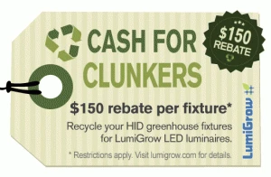 LumiGrow, Inc. has announced a Cash for Clunkers program. Through the new program, commercial growers receive a $150 cash rebate for each high intensity discharge (HID) greenhouse light fixture they replace with a LumiGrow LED luminaire.